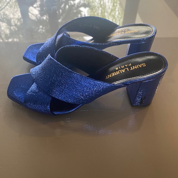 PERFECT CONDITION, ST LAURENT DESIGNER COBALT BLUE SLIDERS WITH 3 " BLOCK HEEL