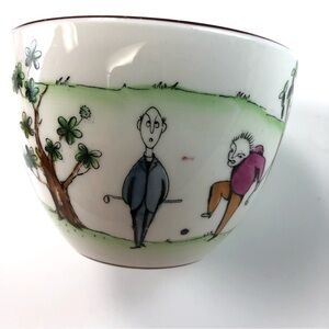 This large Bone China cup with a golf theme believed to be awarded as a Golf Trophy. It’s extra large opening and whimsical design will delight both golfer and tea drinker. Does not come with a saucer and not sure if it ever did have a saucer. No chips discoloration or crazing.