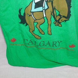 This mens XXL Green STAMPEDE CITY Calgary Graphic T Shirt with Cowboy Riding Horse is in great clean bright condition. Shirt is 100% Cotton - machine washable.