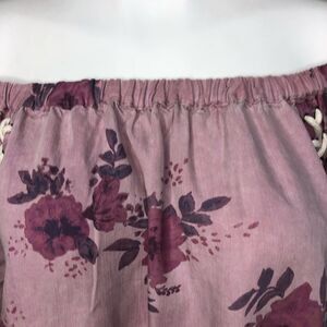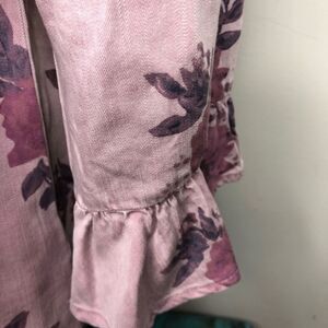 Pre owned. Great condition. Pink Floral top with lace up detail near the sleeves. Elasticized shoulder. Bell ruffle sleeves. 3/4 sleeves. Fringe hem. High low hem.