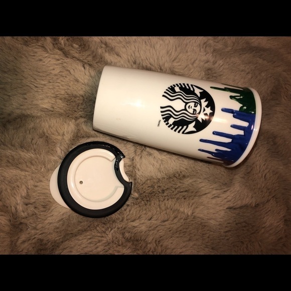 Gorgeous limited edition Starbucks to go ceramic mug - for the artist in your life - rainbow style colour paint drips are printed around the top of the cup, and the word “Drip”