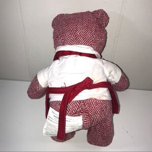 The back of the teddys shirt has been stained light red from the apron. The apron is also untied. Please see photos