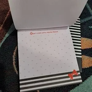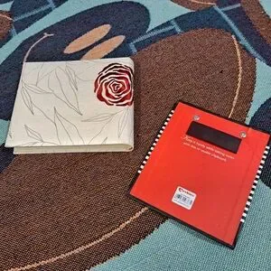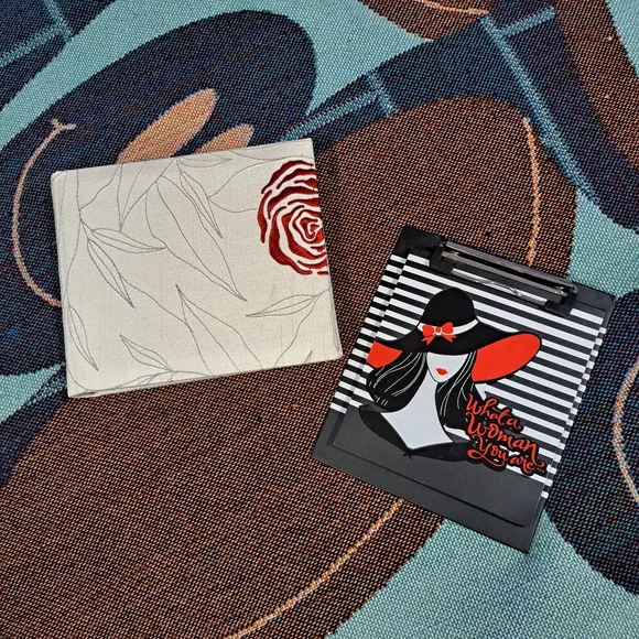 This is a small sketchbook/notebook and notepad I am selling as a set. The book is enveloped in an embroidered silk featuring a bold red rose on a cream/off white back ground. The inside has blank pages made of thick paper. There are also thinner sheets that are semi-transparent for tracing. There is a note in German at the back from the manufacturer, but I can't read it 😅 Maybe you can? The second item is a decorative mini note pad with a magnetic clip board that you can hang on your fridge. It has a very kawaii feel. It features 2 inspirational phrases. On the cover, it says, "What a woman you are" and at the top of each sheet on the inside, it says, "Don't stop until you're proud". Both are in excellent condition. There is one small flaw on the back of the clipboard seen above and considered in the price.