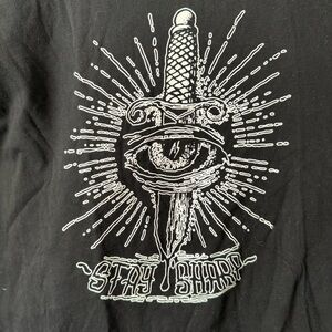 White graphic front with eye + dagger + rays + “Stay Sharp” motto