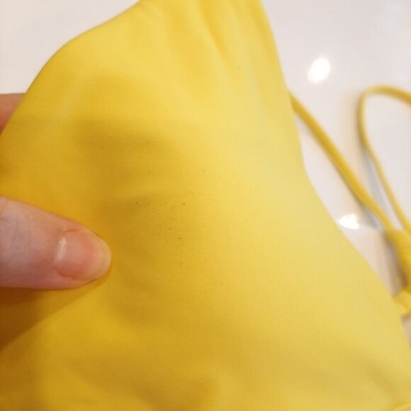 Trendy triangle top in a bright solid yellow with removable padding and adjustable straps. Coordinates perfectly with the vibrant Hawaiian printed high waisted bottoms with side tie detail. Easy to mix and match with other pieces. Perfect for tanning and warm vacations. The bottoms have a tag and hygienic liner that were added by a boutique store.