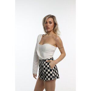 The Stellara Romper features a strapless sweetheart neckline and a sleek, tailored fit. This romper showcases a striking chess pattern and is crafted from a luxurious fabric blend. Built-in cups provide added support and shape, while high-waisted shorts and a concealed center-back zipper complete this sophisticated and modern piece, making it the perfect choice for any stylish event.