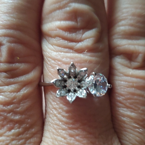 This elegant sterling silver floral ring features a stunning flower design with a sparkling gemstone.