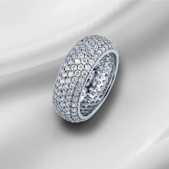Solid sterling silver, then rhodium plated, so it doesn’t tarnish and need to be polished the same way non-podium plated silver does! Looks like platinum to the eye. Man made stones. Very sparkly!