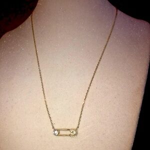 Adorable yellow gold toned sterling silver cable link chain with affixed safety pin pendant. Safety pin has 1 large stone on one end and the head of the safety pin has small sparkly stones that catch the light.