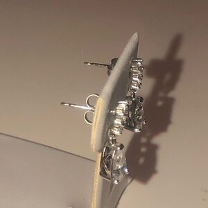 Sterling silver white cz stone stud earrings - vertical bar of smaller cz stones connected to a larger pear shaped cz drop.