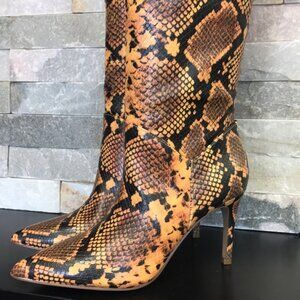 A contour-hugging shaft brings gorgeously curvy counterpoint to the pointy toe and notched piecing of a knee-high boot towering on a tall stiletto.