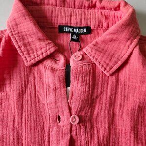 Lightweight Cotton Gauze. Drawstring Waist. Elastic Waistband. Full Length Wide Leg Pant. Cotton gauze fabrication. Collar neckline. Long sleeves. Front button closure.