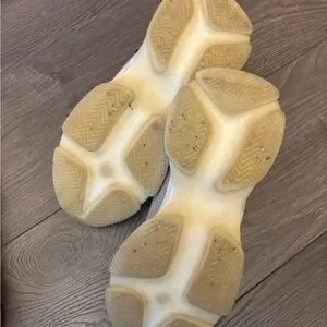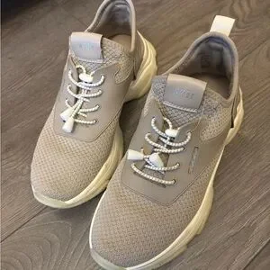Very good condition steve madden running shoes. elevated at the back so they do not stress out the feet. Clean at the bottom with exception to some small rocks stuck in the crevices. Lavender/grey colour with adjustable laces.