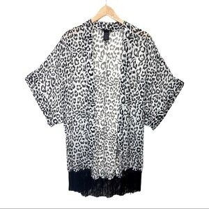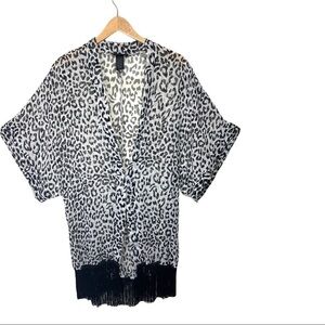 STEVE Madden Sheer Black White Fringed Swim Cover up Kimono Leopards Print O/S