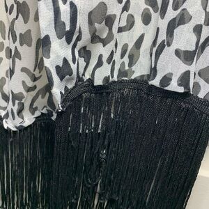 in Great conditions, Well made, lightweight cover up kimono style, great for vacation resort wear. Black white animal print with black fringes. One size