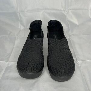 Ladies Solid Black chunky Steven by Steven Madden textile basket weave platform wedge shoes. Almond toe.