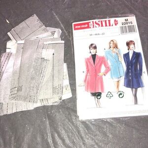 STIL multisize sewing pattern for stylish coats. Includes options for pink, blue, and black designs.