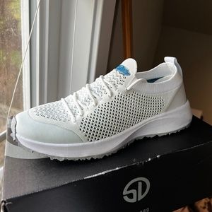 It is a Straight Down woman's golf shoe, in white, brand new, featuring a Knit upper using 50% recycled polyester threads, and it is breathable,