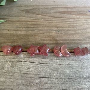 Little Strawberry Quartz stud earrings in 4 different shapes: Hearts, Squares, Moons, and Stars.