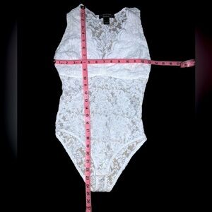 Streetwear Society cream lace bodysuit. Stretch material with v-neck and racer back styling. Lined in breast area and semi-sheer throughout remainder of garment. Item has been thoroughly washed and sanitized. In excellent condition. Ladies size SMALL
