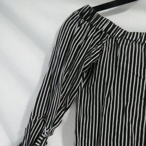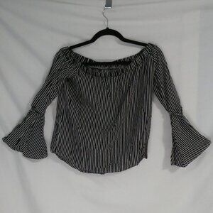 A stylish black and white striped off shoulder top with elegant bell sleeves