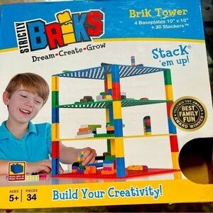 New. Assembled once. Four 10 inch x 10 inch grey LEGO-compatible base plates and 30 stackers. Winner of the Tillywig Toy Awards Best Family Fun! Build your creativity! Recommended for ages 5+. Great for vertical building. Comes with original box. Will come packed in original box. Literally just taken out of box for photos. Smoke-free and cat-free home.