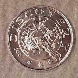 DETAILS: Metal commemorative medallion. FRONT: Has words STS-96 DISCOVERY and triangle mission logo with earth, a star and orbit, the shuttle, American flag, and a satellite. Words say Rominger - Husband - Payette - Tokapeb - Jernigan - Ochoa - Barry. BACK: Has word DISCOVERY 103 and an image.