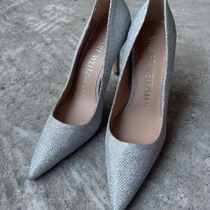 The STUART WEITZMAN 100 PUMP in "CRYSTAL" -- sleek pointed toe and 100-mm stiletto heel. 100% calf leather soles and lining. Made in Spain.