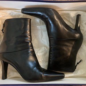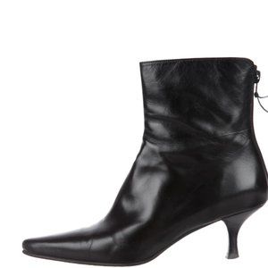 Black leather Stuart Weitzman Apollo pointed round-toe ankle boots with tonal stitching, covered heels and exposed tonal zip closures at counters. Includes box. Heels: 2"