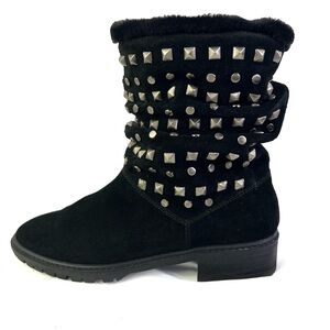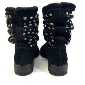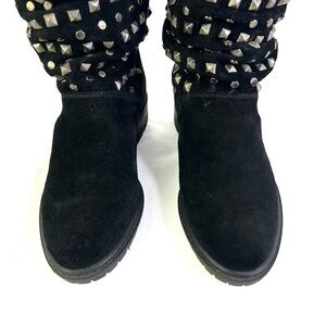 Meta: Explore the Stuart Weitzman Black Leather Boots adorned with studs, a cozy and stylish choice for women in size 5.5M. The boots feature a teddy bear lining, faux shearling, and block heels for a super cozy and easy-to-wear experience.