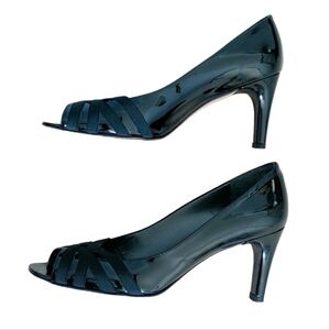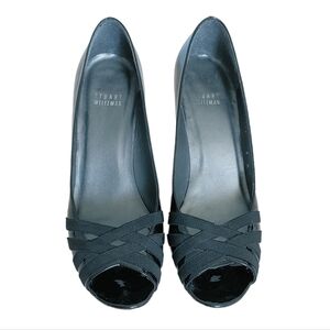 STUART WEITZMAN Bandaritz black, patent leather, criss cross detail, leather lining and soles, peep toe 3" heels, size 8.