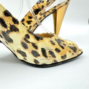 STUART WEITZMAN GOLD ANIMAL PRINTS SLING BACK HEELS OPEN TOE SHOE PATENT LEATHER