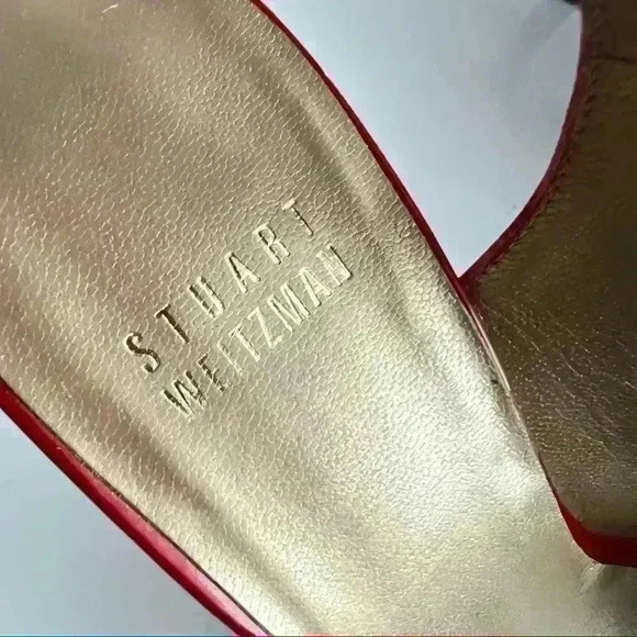 Stuart Weitzman red sandals, red leather slingback, open-toe kitten heels, holiday party shoes, Christmas sandals, glossy red heels, women’s festive footwear, elegant red sandals