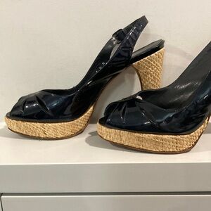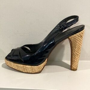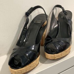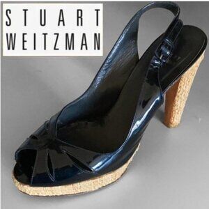 Stuart Weitzman Women’s Black patent leather peep toe and sling back with platform for style and comfort.