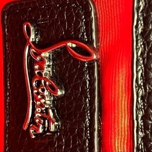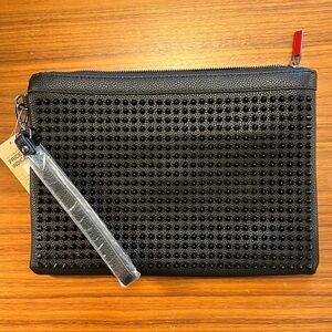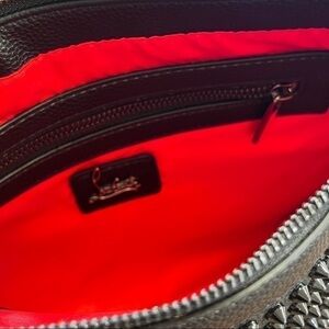 The pouch is crafted of black calfskin leather, covered in matching black cone studs. The bag features a black leather strap with a red lining interior.