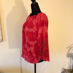 Beautiful rayon blouse with tie dye effect fabric. Gorgeous lace bell sleeves. Beautiful elasticized neckline. Flattering, generous fit.