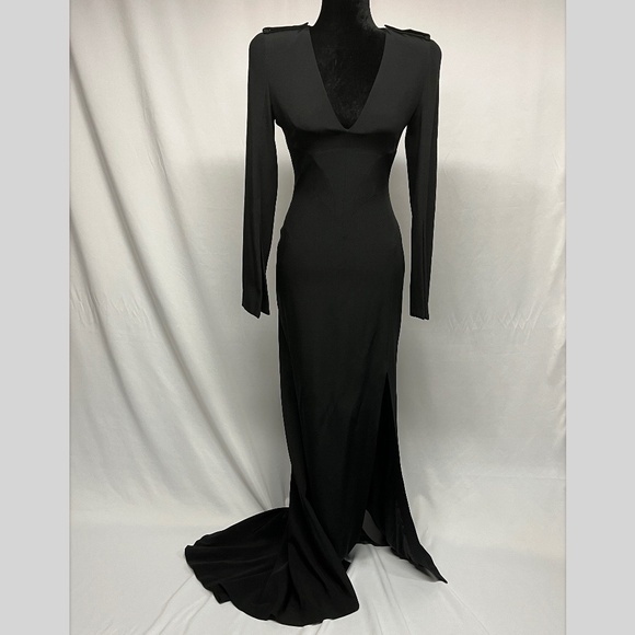 This full length gown has the incredible tailoring and sexy fit McQueen is known for. It is a buttery silk with silk satin lining. It is 60 inches long in the front and has a beautiful train. There is a deep V plunge in the front and epaulettes on the shoulders. And in case you wanted more sexiness, there is a high slit in the front.