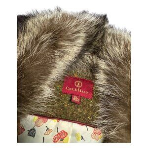 Stay warm and stylish in this stunning Cole Haan designer jacket for women in size XL. Made from genuine fur and wool, this mid-length jacket features a solid brown color with a luxurious fur lining.