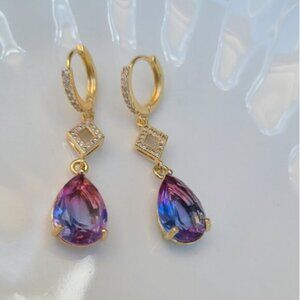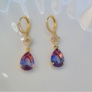 STUNNING Gold Tone Iridescent Blue Purple Crystal Drop Dangle Earrings