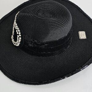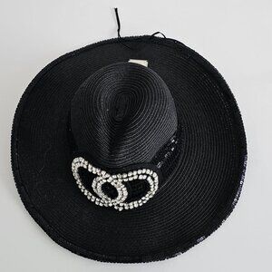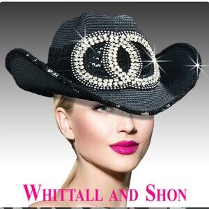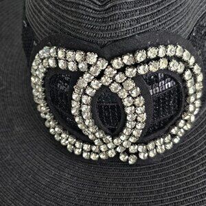 Western Hat adorned with twin crystal rings- not for the tame at heart. Adjustable sweat band to accommodate varying head sizes.