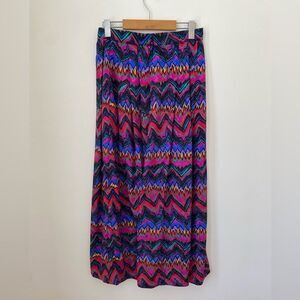 I've never seen a more incredible skirt! These colours are just incredible. Flat waistband. Back zip with button closure. There are no material tags but it feels like an incredibly well made satin-very silky. Rate. In excellent preloved condition.