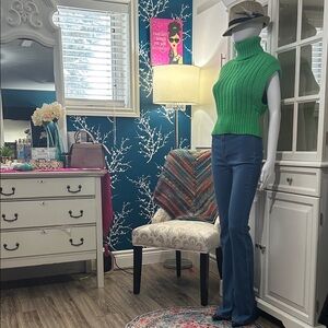 Vibrant green turtleneck. Sleeveless and ribbed. Ideal for layering. In size M