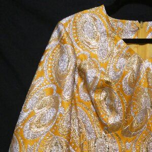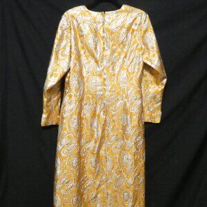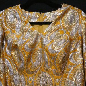 A long sleeved gold dress with an intricate paisley pattern throughout