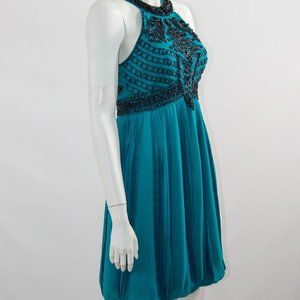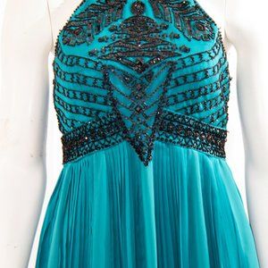 Gorgeous teal Beaded Cocktail Dress. Halter style dress with beaded embellishment on bodice and waist. Lightly padded bodice bust line. Invisible side zipper. Closed bottom hemline. Lined.
