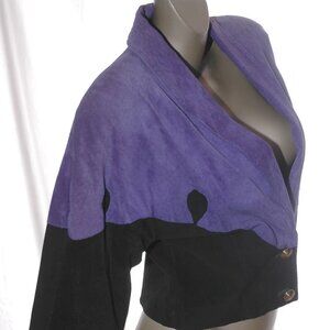 Suede Leather Cropped Jacket. Black & Deep Purple. Low 'V' front with 2 button closure, has no pockets. In Excellent Condition. "Massimo" size Medium. Vintage 80s / 90s
