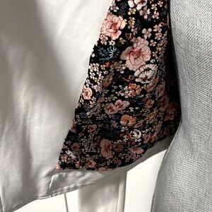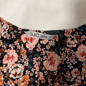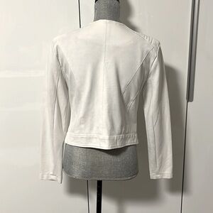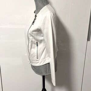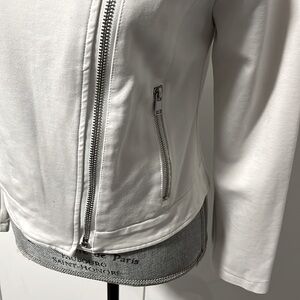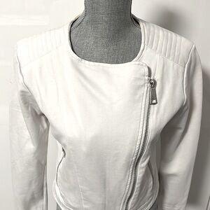 SUKO JEANS white moto biker style jacket in stretch material. Silver zipper closure in front and 2 zippered pockets. Pretty floral lining. Excellent gently used condition.