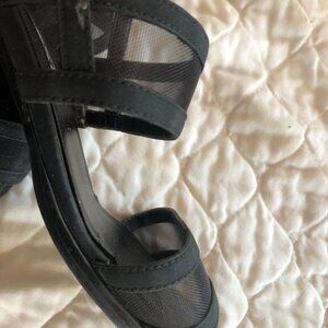 black sandals, 2 comfy sheer cross bands 2" block heel adjustable straps