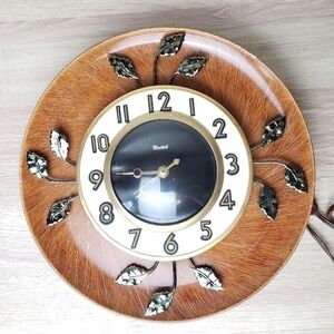 Brass leaves sprout out from each side of the clock, and contrasts well off the faux teak backing.