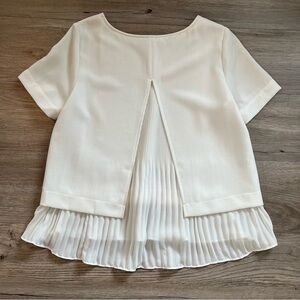 Chic ivory blouse with pleated hem. Short sleeves and round neckline. Perfect for versatile styling.