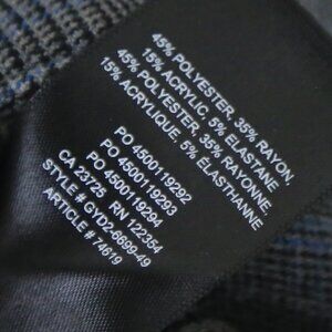 This is a fitted, slim-leg trouser with denim-like detailing. The stretchy fabric is yarn dyed, which means the check print is woven right in. Neat. Front faux pockets. Zipper fly. Leg crease. Content: 45% polyester, 35% rayon, 15% acrylic, 5% elastane.